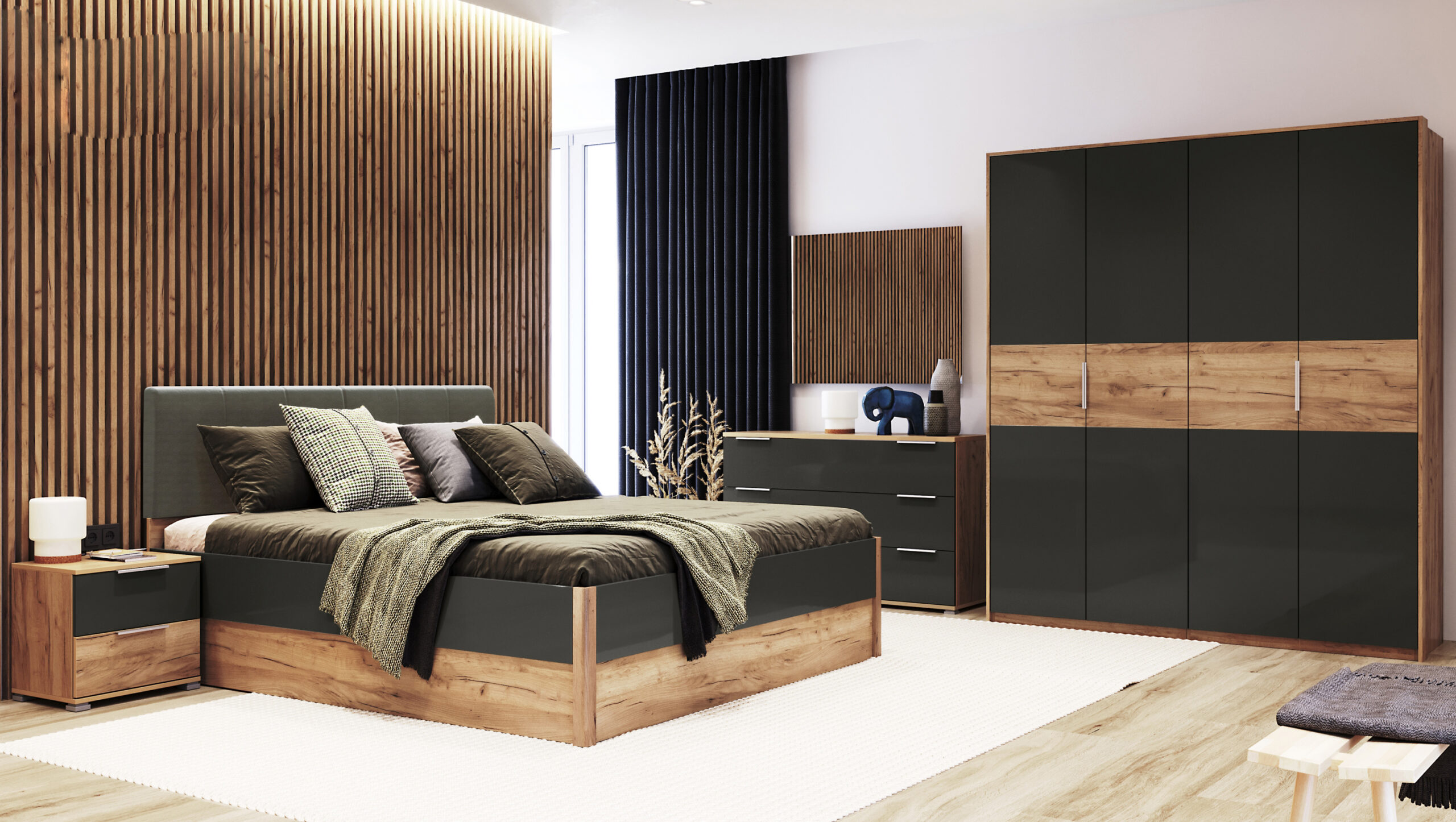 Меблі для спальні Рамона – це гармонійне поєднання всіх елементів в одній стильовій композиції. Основними елементами гарнітуру є ліжко, шафа, приліжкові тумбочки та комод з джеркалом. Функціональність комплекту дозволить в повній мірі забезпечити всім необхідним у користуванні кожного предмету гарнітуру. Поєднання сучасності та комфорту.
