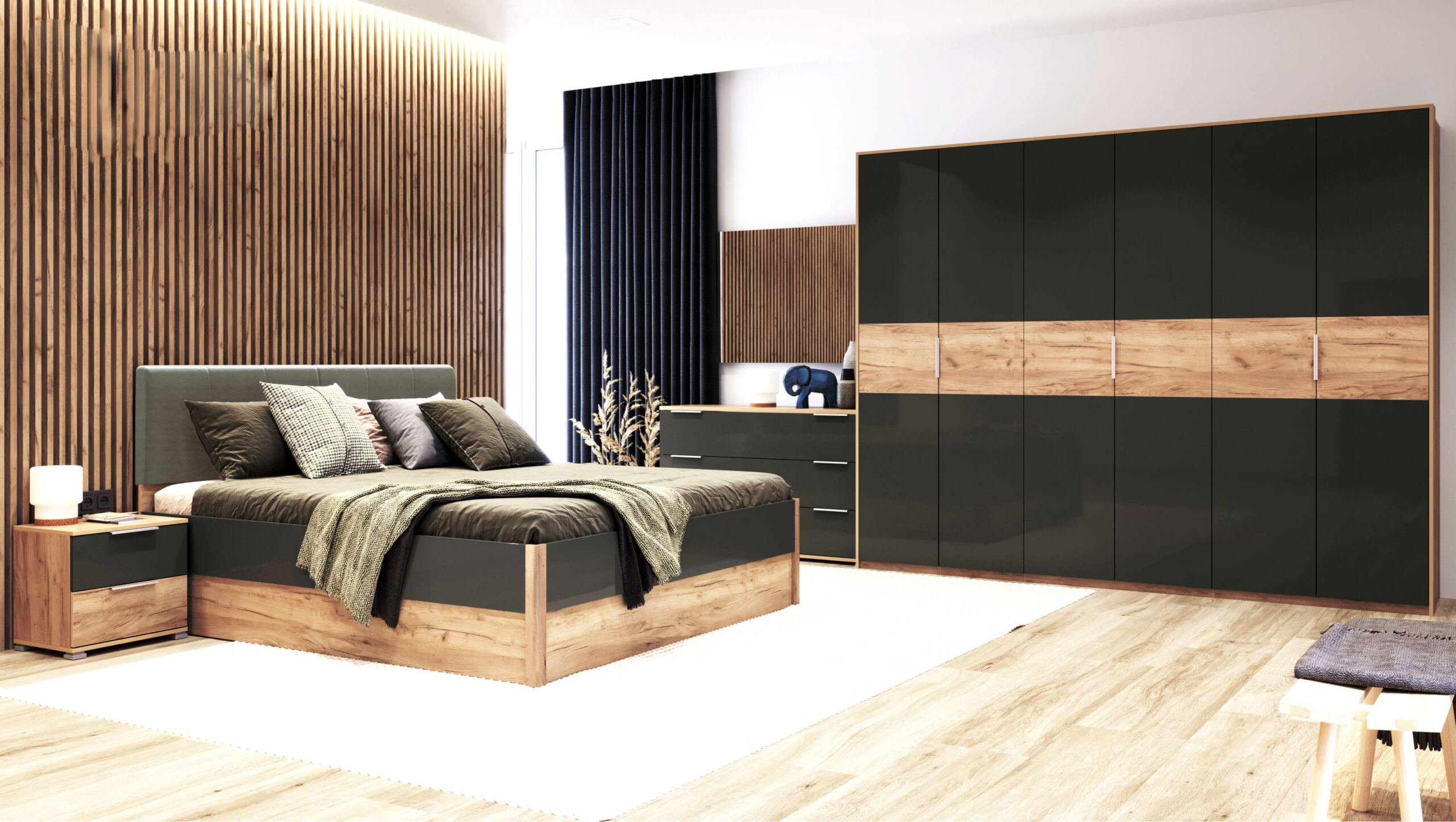 Меблі для спальні Рамона – це гармонійне поєднання всіх елементів в одній стильовій композиції. Основними елементами гарнітуру є ліжко, шафа, приліжкові тумбочки та комод з джеркалом. Функціональність комплекту дозволить в повній мірі забезпечити всім необхідним у користуванні кожного предмету гарнітуру. Поєднання сучасності та комфорту.