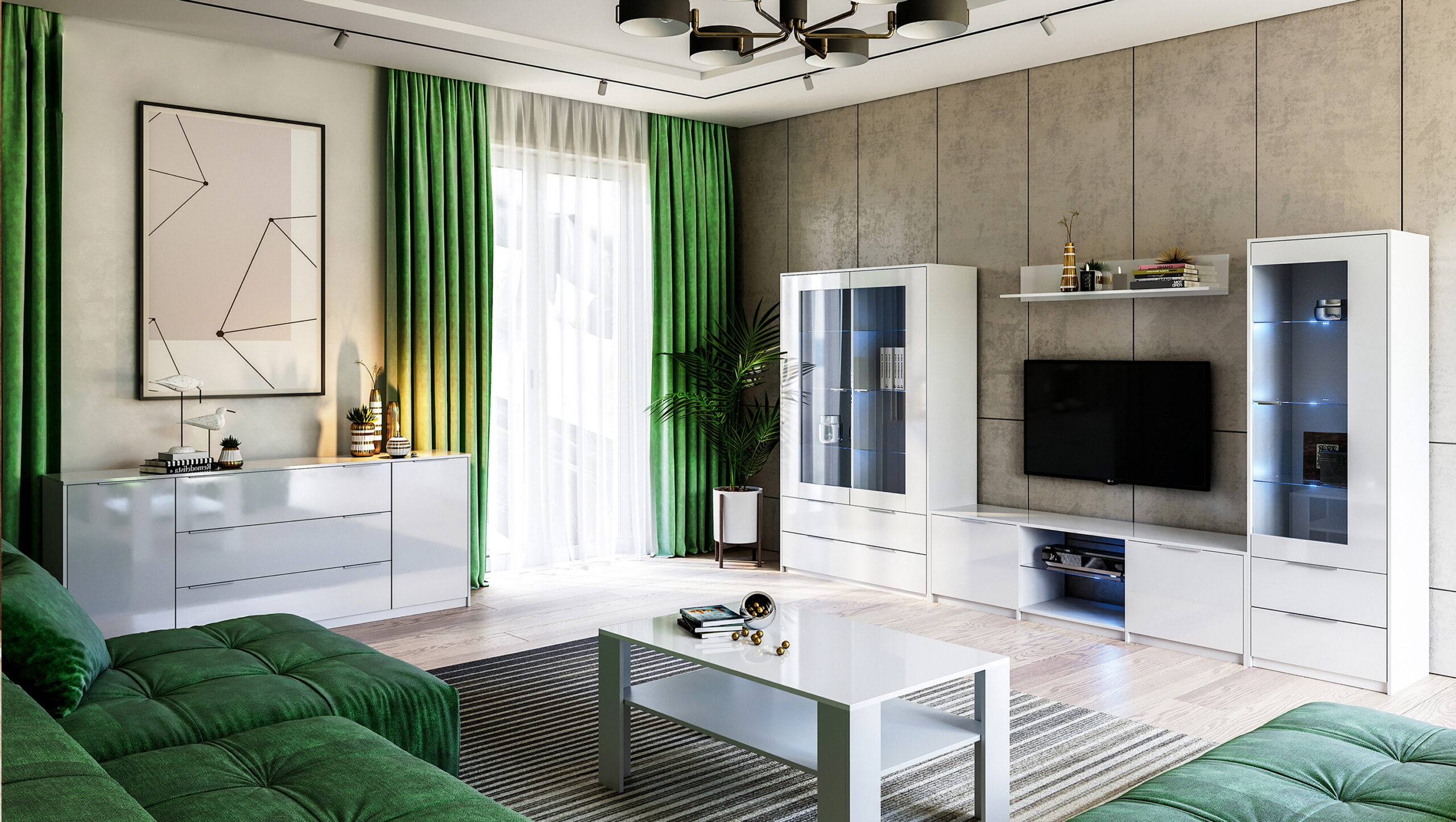 Білосніжна і стильна модель в стилі мінімалізм, ідеально підійде для квартир в сучасному стилі. Гарнітур даної моделі виготовлений в благородному білому кольорі і характеризується чіткими і строгими лініями, практичними формами, якісної і оригінальною фурнітурою. Стиль, ергономіка та функціональність в одному комплекті для Вашої ідеальної вітальні.