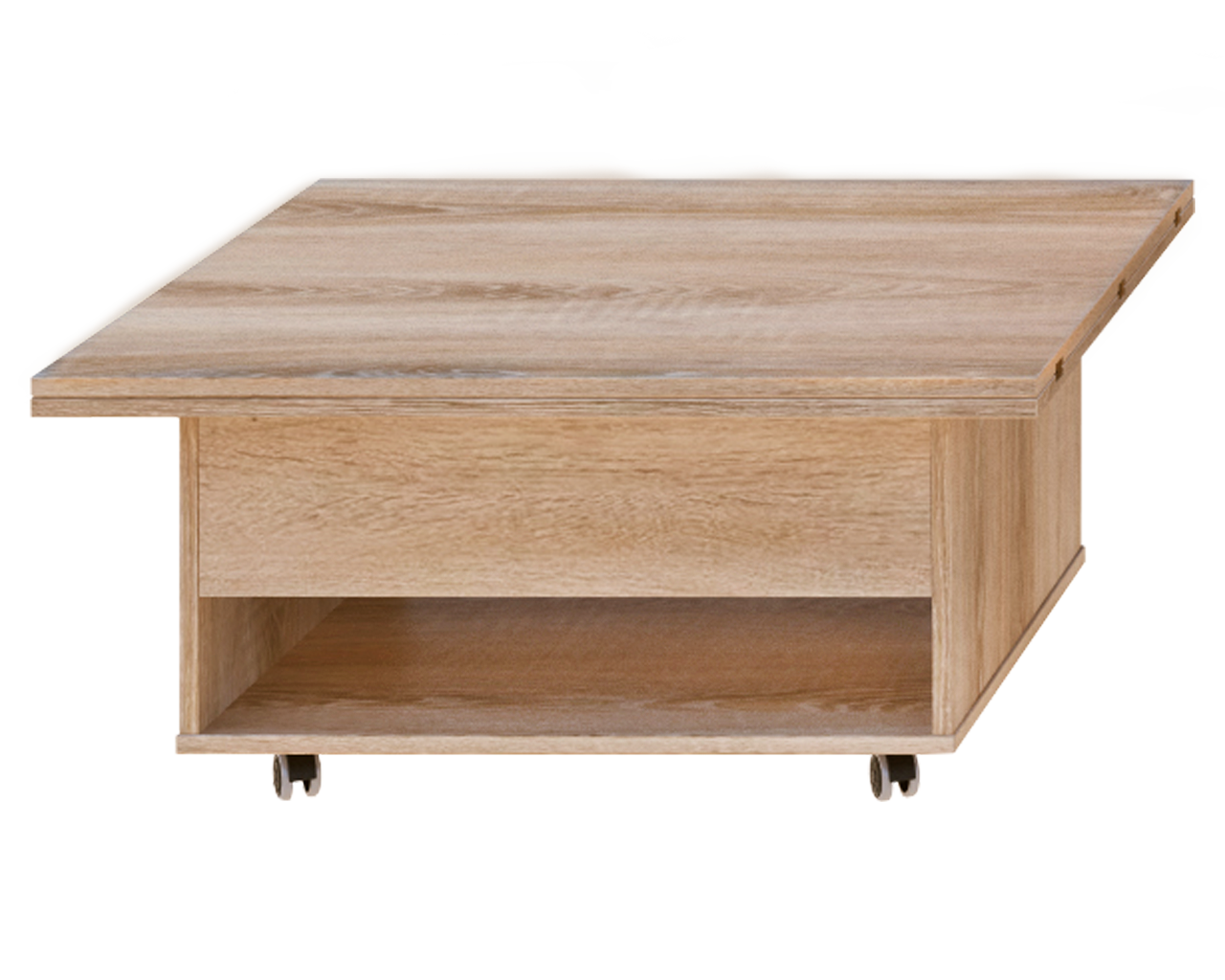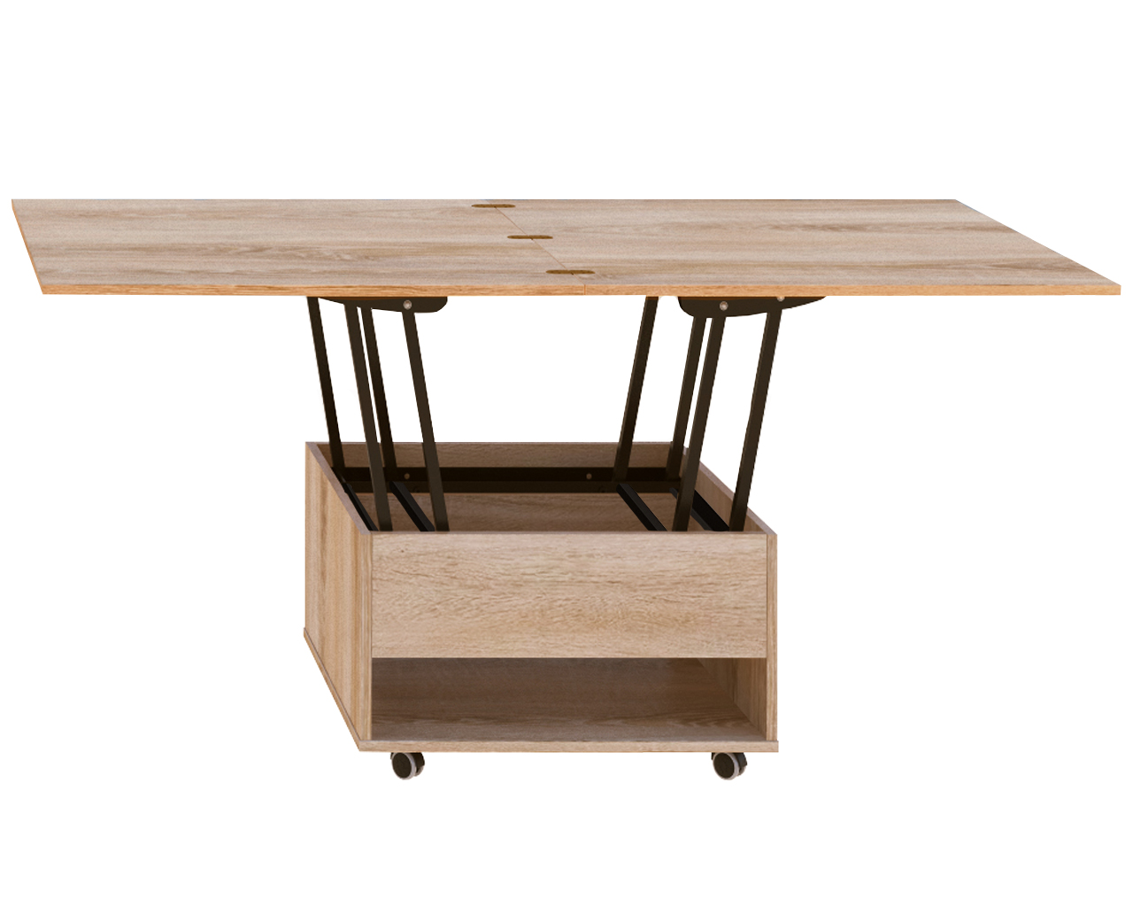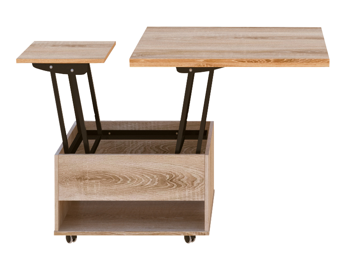 Журнально-обідній стіл-трансформер, який дозволяє економити простір в приміщенні. красивий, функціональний і практичний стіл. Стільниця являє собою дві скріплені рояльними петлями панелі, встановлені одна над іншою. При необхідності верхню частину можна відкинути в сторону, за рахунок механізму трансформації він легко перетворюється в банкетний, кухонний або обідній стіл. І вирішує питання розташування всіх гостей на свята і сімейні торжества.